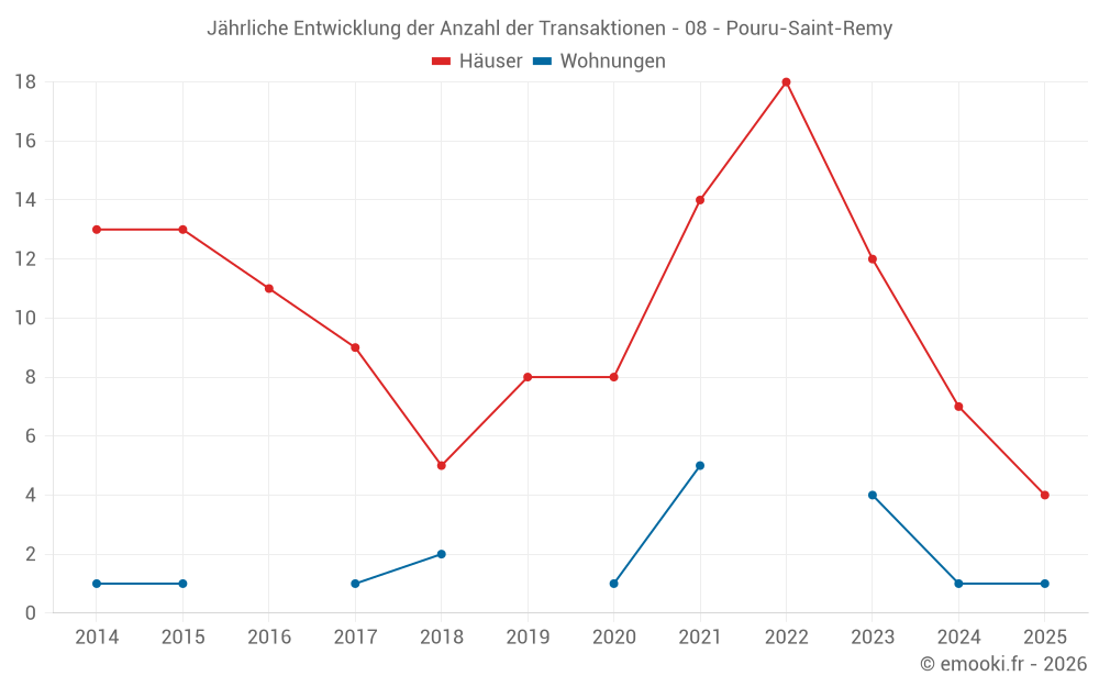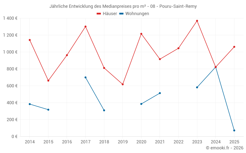 Der Durchschnittspreis auf den 19 Hausgeschäften der letzten 24 Monate in der Gemeinde Pouru-Saint-Remy betrug 1 133 € pro Quadratmeter für einen mittleren Immobilienwert von 100 000 €. Über diesen Zeitraum hinweg lagen 60% der Transaktionen zwischen 576 und 1 496 € pro Quadratmeter (vom 2. bis zum 8. Dezil).