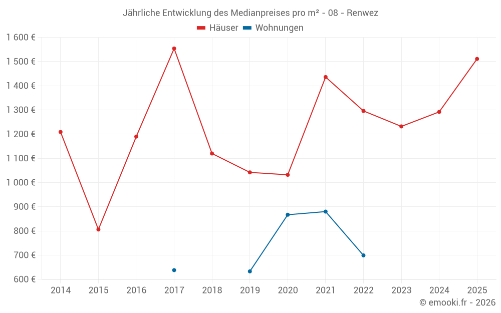 Der Durchschnittspreis auf den 35 Hausgeschäften der letzten 24 Monate in der Gemeinde Renwez betrug 1 234 € pro Quadratmeter für einen mittleren Immobilienwert von 110 000 €. Über diesen Zeitraum hinweg lagen 60% der Transaktionen zwischen 765 und 1 962 € pro Quadratmeter (vom 2. bis zum 8. Dezil).