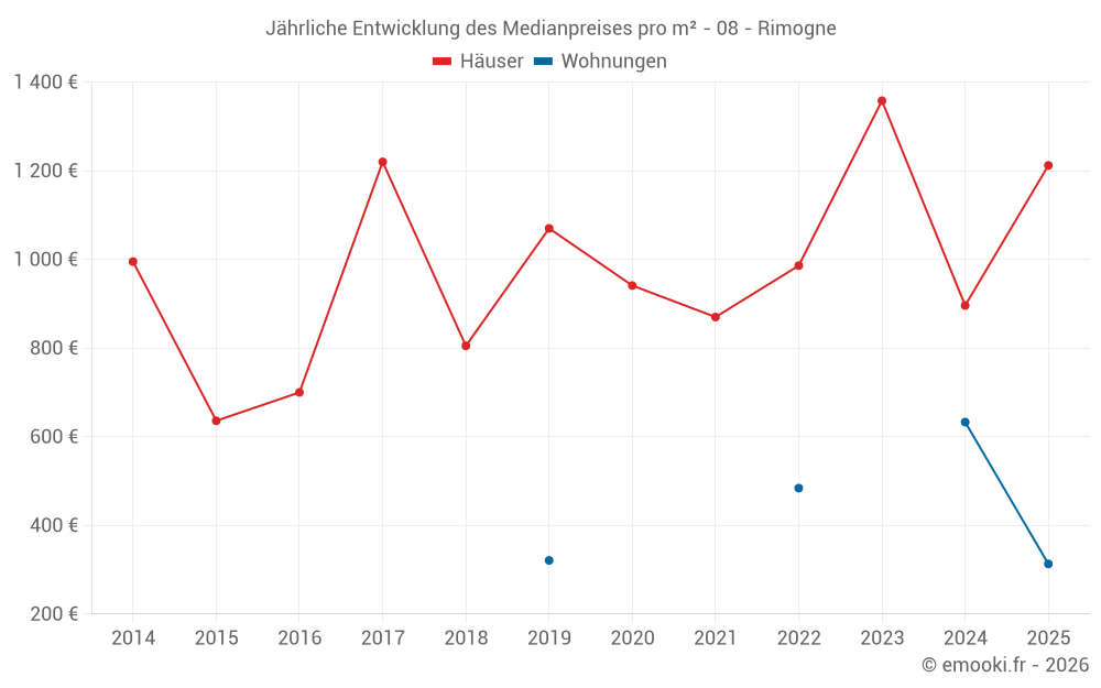 Der Durchschnittspreis auf den 24 Hausgeschäften der letzten 24 Monate in der Gemeinde Rimogne betrug 1 212 € pro Quadratmeter für einen mittleren Immobilienwert von 133 500 €. Über diesen Zeitraum hinweg lagen 60% der Transaktionen zwischen 666 und 1 697 € pro Quadratmeter (vom 2. bis zum 8. Dezil).