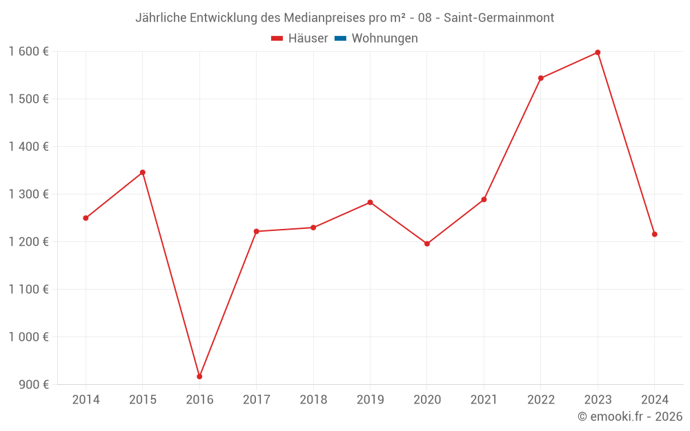 Der Durchschnittspreis auf den 14 Hausgeschäften der letzten 24 Monate in der Gemeinde Saint-Germainmont betrug 1 442 € pro Quadratmeter für einen mittleren Immobilienwert von 123 250 €. Über diesen Zeitraum hinweg lagen 60% der Transaktionen zwischen 979 und 1 692 € pro Quadratmeter (vom 2. bis zum 8. Dezil).