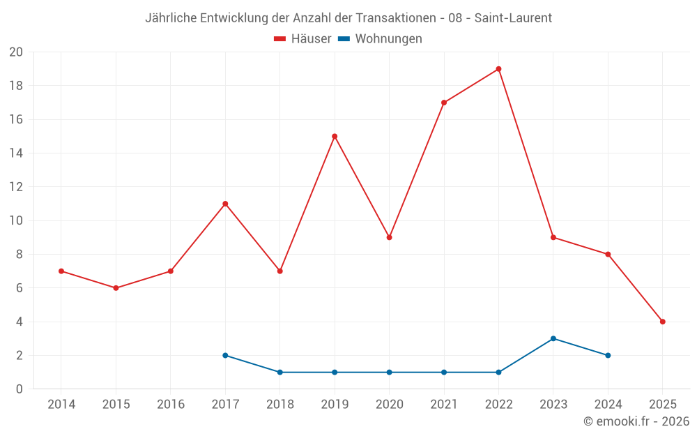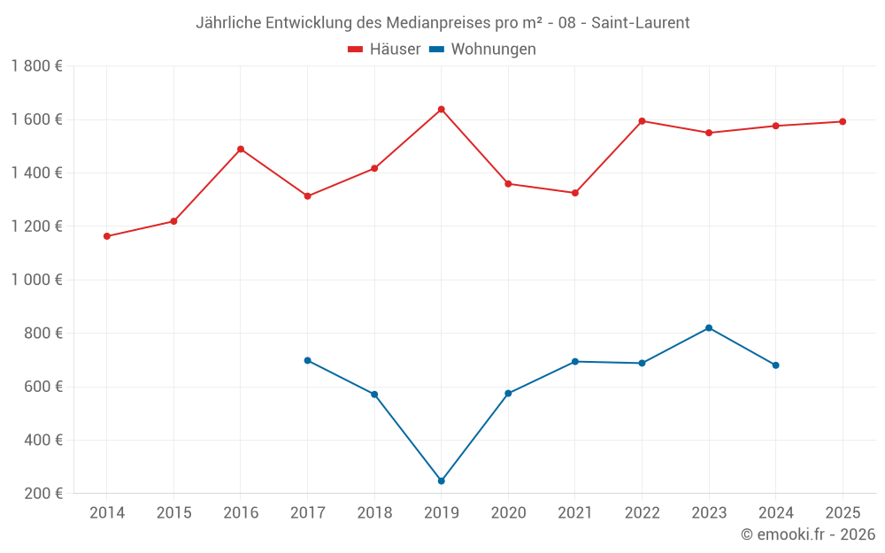 Der Durchschnittspreis auf den 16 Hausgeschäften der letzten 24 Monate in der Gemeinde Saint-Laurent betrug 1 589 € pro Quadratmeter für einen mittleren Immobilienwert von 162 450 €. Über diesen Zeitraum hinweg lagen 60% der Transaktionen zwischen 1 014 und 2 069 € pro Quadratmeter (vom 2. bis zum 8. Dezil).