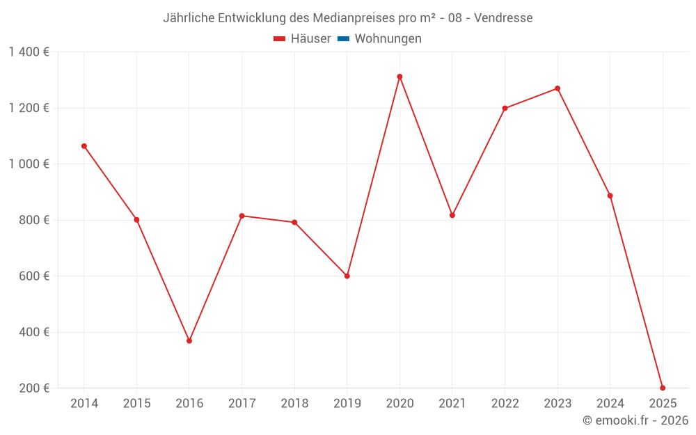 Der Durchschnittspreis auf den 14 Hausgeschäften der letzten 24 Monate in der Gemeinde Vendresse betrug 968 € pro Quadratmeter für einen mittleren Immobilienwert von 124 646 €. Über diesen Zeitraum hinweg lagen 60% der Transaktionen zwischen 579 und 1 276 € pro Quadratmeter (vom 2. bis zum 8. Dezil).