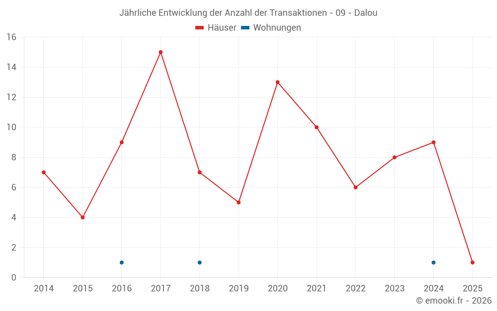 Der Durchschnittspreis auf den 15 Hausgeschäften der letzten 24 Monate in der Gemeinde Dalou betrug 1 650 € pro Quadratmeter für einen mittleren Immobilienwert von 145 000 €. Über diesen Zeitraum hinweg lagen 60% der Transaktionen zwischen 1 255 und 2 056 € pro Quadratmeter (vom 2. bis zum 8. Dezil).