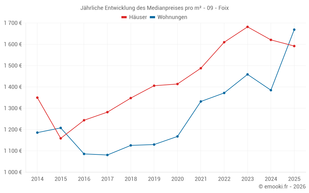 Der Durchschnittspreis auf den 59 Hausgeschäften der letzten 12 Monate in der Gemeinde Foix betrug 1 621 € pro Quadratmeter für einen mittleren Immobilienwert von 153 000 €. Über diesen Zeitraum hinweg lagen 60% der Transaktionen zwischen 1 117 und 2 207 € pro Quadratmeter (vom 2. bis zum 8. Dezil).