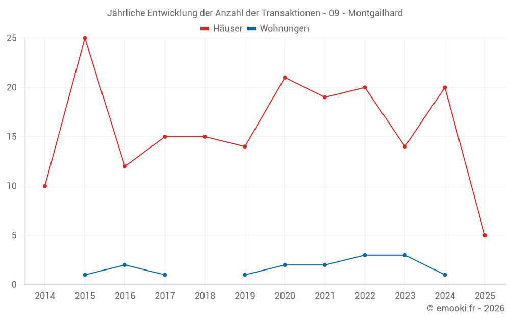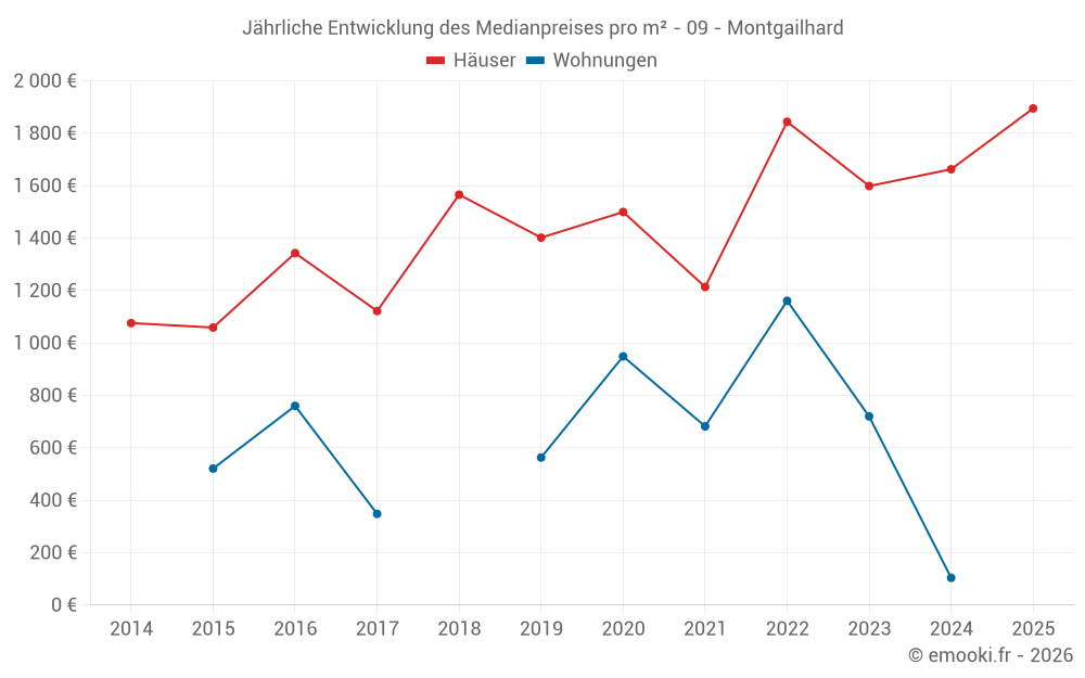 Der Durchschnittspreis auf den 16 Hausgeschäften der letzten 12 Monate in der Gemeinde Montgailhard betrug 1 905 € pro Quadratmeter für einen mittleren Immobilienwert von 157 500 €. Über diesen Zeitraum hinweg lagen 60% der Transaktionen zwischen 1 195 und 2 787 € pro Quadratmeter (vom 2. bis zum 8. Dezil).