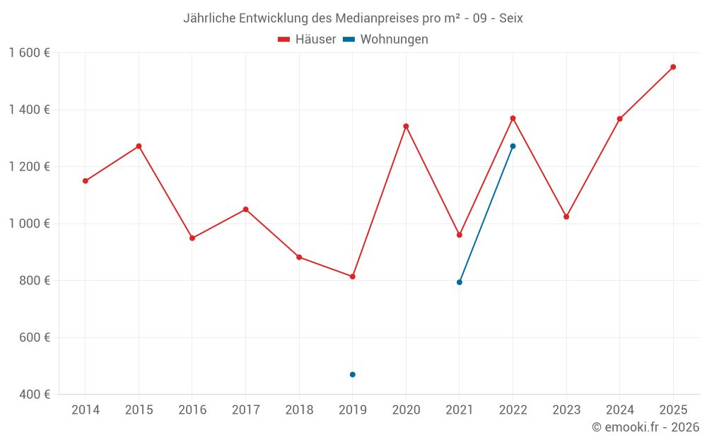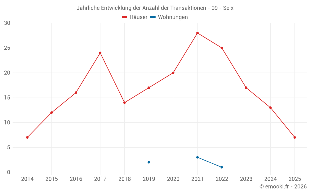 Der Durchschnittspreis auf den 26 Hausgeschäften der letzten 24 Monate in der Gemeinde Seix betrug 1 501 € pro Quadratmeter für einen mittleren Immobilienwert von 117 375 €. Über diesen Zeitraum hinweg lagen 60% der Transaktionen zwischen 964 und 2 635 € pro Quadratmeter (vom 2. bis zum 8. Dezil).