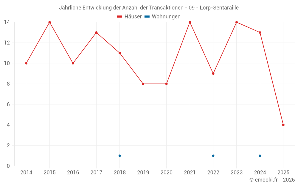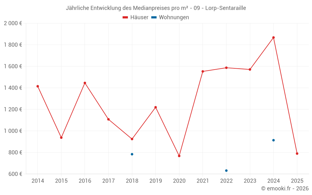 Der Durchschnittspreis auf den 23 Hausgeschäften der letzten 24 Monate in der Gemeinde Lorp-Sentaraille betrug 1 847 € pro Quadratmeter für einen mittleren Immobilienwert von 150 000 €. Über diesen Zeitraum hinweg lagen 60% der Transaktionen zwischen 765 und 2 098 € pro Quadratmeter (vom 2. bis zum 8. Dezil).