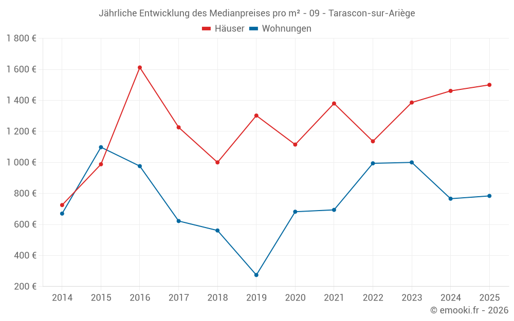 Der Durchschnittspreis auf den 22 Hausgeschäften der letzten 12 Monate in der Gemeinde Tarascon-sur-Ariège betrug 1 502 € pro Quadratmeter für einen mittleren Immobilienwert von 139 225 €. Über diesen Zeitraum hinweg lagen 60% der Transaktionen zwischen 1 067 und 2 275 € pro Quadratmeter (vom 2. bis zum 8. Dezil).
