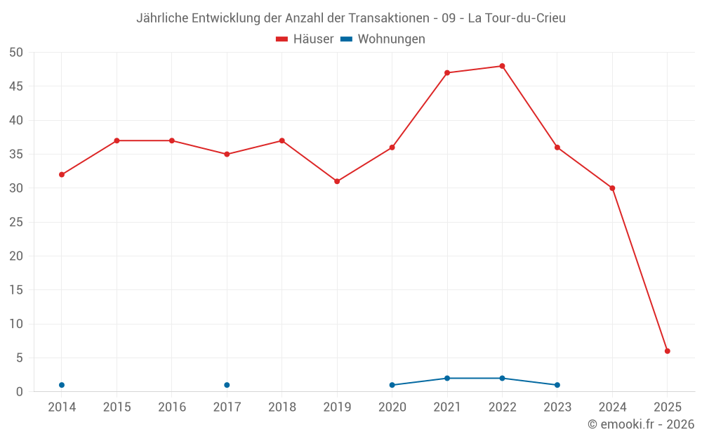Der Durchschnittspreis auf den 25 Hausgeschäften der letzten 12 Monate in der Gemeinde La Tour-du-Crieu betrug 1 857 € pro Quadratmeter für einen mittleren Immobilienwert von 188 000 €. Über diesen Zeitraum hinweg lagen 60% der Transaktionen zwischen 1 468 und 2 266 € pro Quadratmeter (vom 2. bis zum 8. Dezil).
