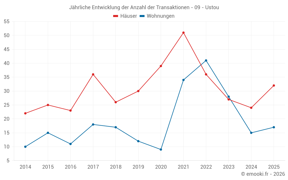 Der Durchschnittspreis auf den 17 Wohnungstransaktionen der letzten 12 Monate in der Gemeinde Ustou betrug 1 367 € pro Quadratmeter für einen mittleren Immobilienwert von 53 930 €. Über diesen Zeitraum hinweg lagen 60% der Transaktionen zwischen 1 191 und 1 725 € pro Quadratmeter (vom 2. bis zum 8. Dezil).