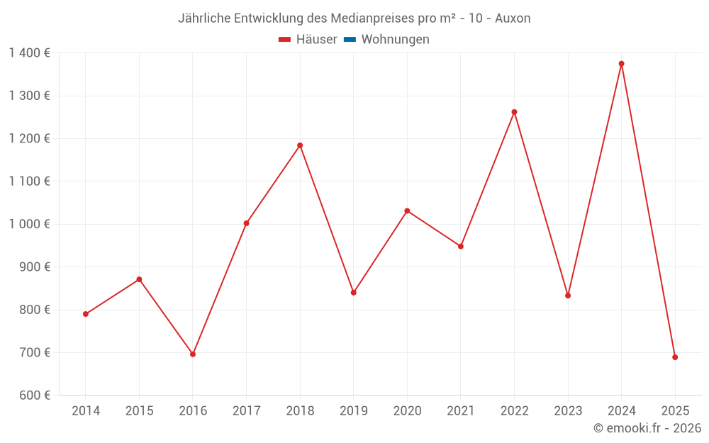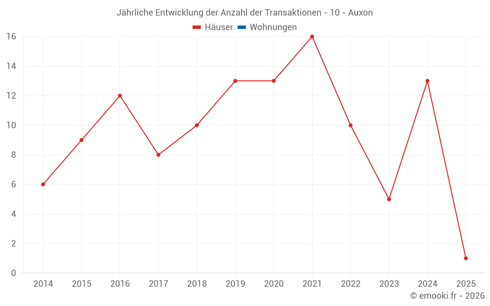 Der Durchschnittspreis auf den 16 Hausgeschäften der letzten 24 Monate in der Gemeinde Auxon betrug 1 355 € pro Quadratmeter für einen mittleren Immobilienwert von 155 000 €. Über diesen Zeitraum hinweg lagen 60% der Transaktionen zwischen 970 und 1 648 € pro Quadratmeter (vom 2. bis zum 8. Dezil).