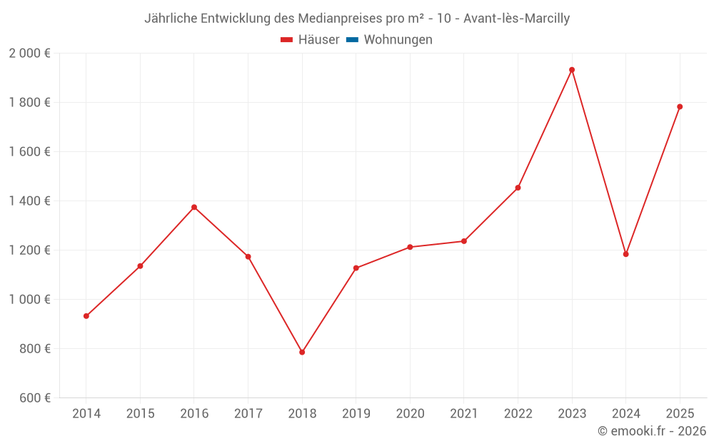 Der Preis pro m² von Häusern ist seit 2 Jahren um 7.8% gesunken, aber er ist in 11 Jahren um 91% gestiegen.