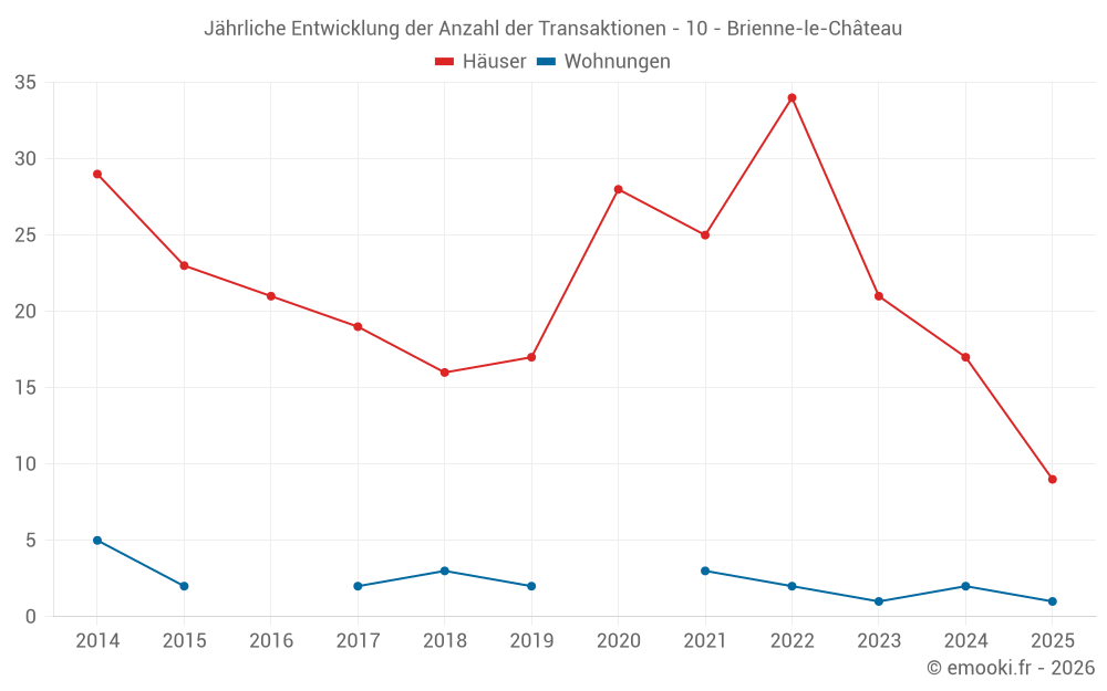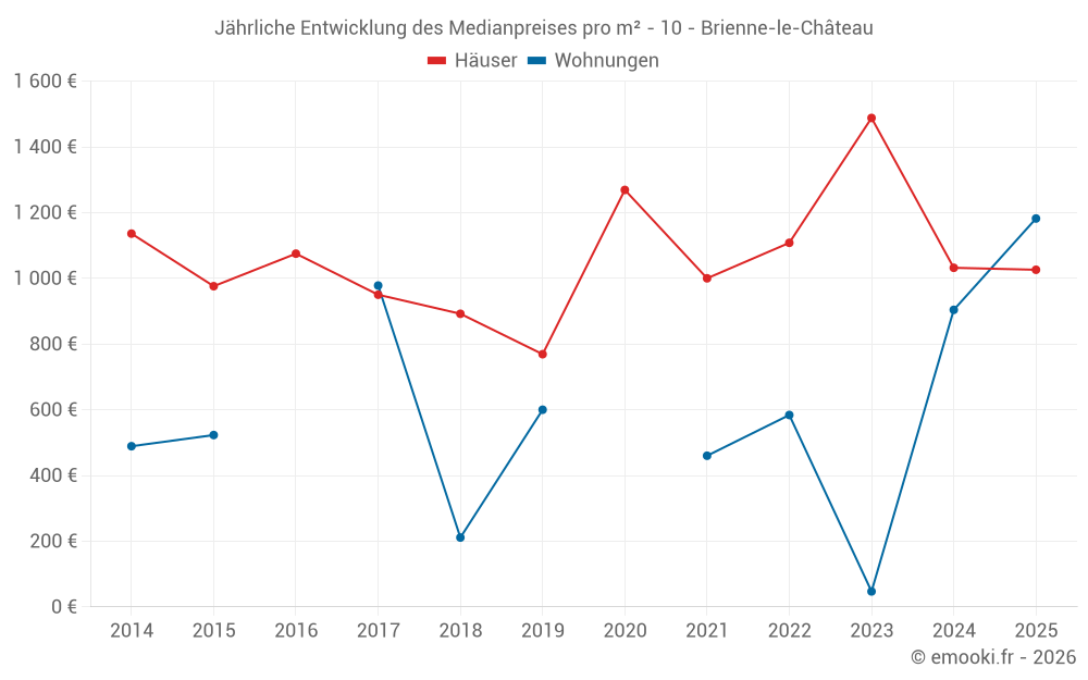 Der Durchschnittspreis auf den 19 Hausgeschäften der letzten 12 Monate in der Gemeinde Brienne-le-Château betrug 962 € pro Quadratmeter für einen mittleren Immobilienwert von 95 000 €. Über diesen Zeitraum hinweg lagen 60% der Transaktionen zwischen 681 und 1 262 € pro Quadratmeter (vom 2. bis zum 8. Dezil).