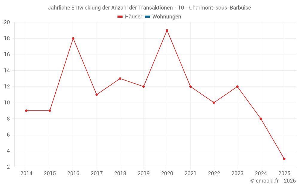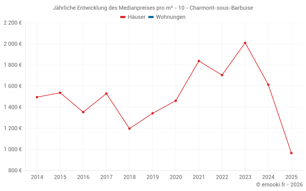Der Durchschnittspreis auf den 18 Hausgeschäften der letzten 24 Monate in der Gemeinde Charmont-sous-Barbuise betrug 1 614 € pro Quadratmeter für einen mittleren Immobilienwert von 223 000 €. Über diesen Zeitraum hinweg lagen 60% der Transaktionen zwischen 1 053 und 2 056 € pro Quadratmeter (vom 2. bis zum 8. Dezil).