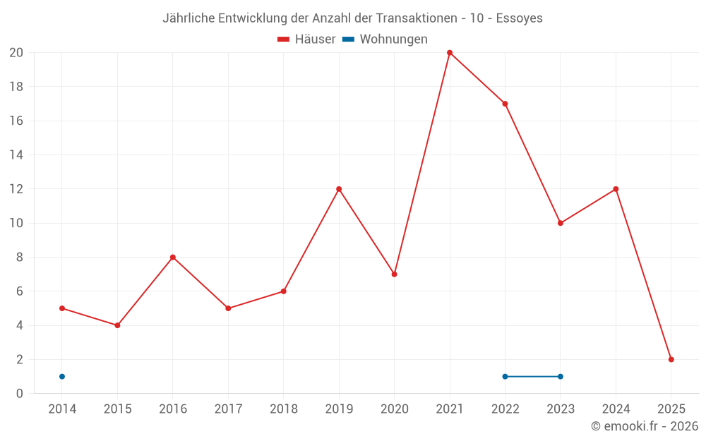 Der Durchschnittspreis auf den 19 Hausgeschäften der letzten 24 Monate in der Gemeinde Essoyes betrug 720 € pro Quadratmeter für einen mittleren Immobilienwert von 50 175 €. Über diesen Zeitraum hinweg lagen 60% der Transaktionen zwischen 331 und 1 234 € pro Quadratmeter (vom 2. bis zum 8. Dezil).