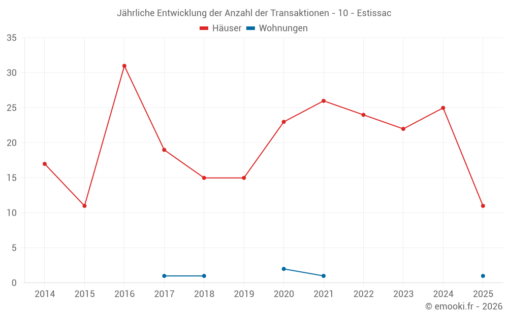 Der Durchschnittspreis auf den 28 Hausgeschäften der letzten 12 Monate in der Gemeinde Estissac betrug 1 288 € pro Quadratmeter für einen mittleren Immobilienwert von 112 500 €. Über diesen Zeitraum hinweg lagen 60% der Transaktionen zwischen 893 und 1 657 € pro Quadratmeter (vom 2. bis zum 8. Dezil).
