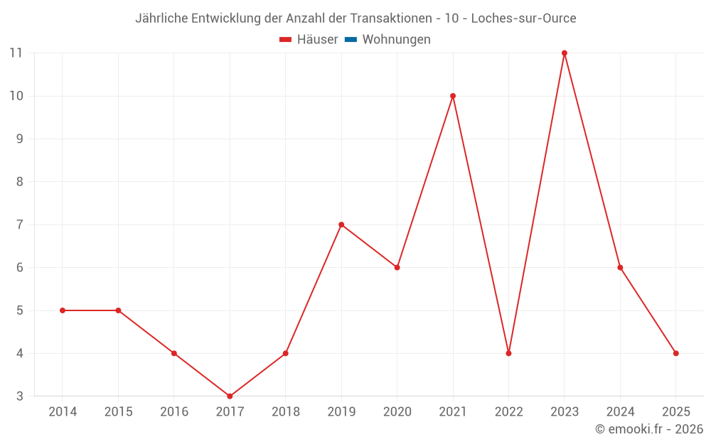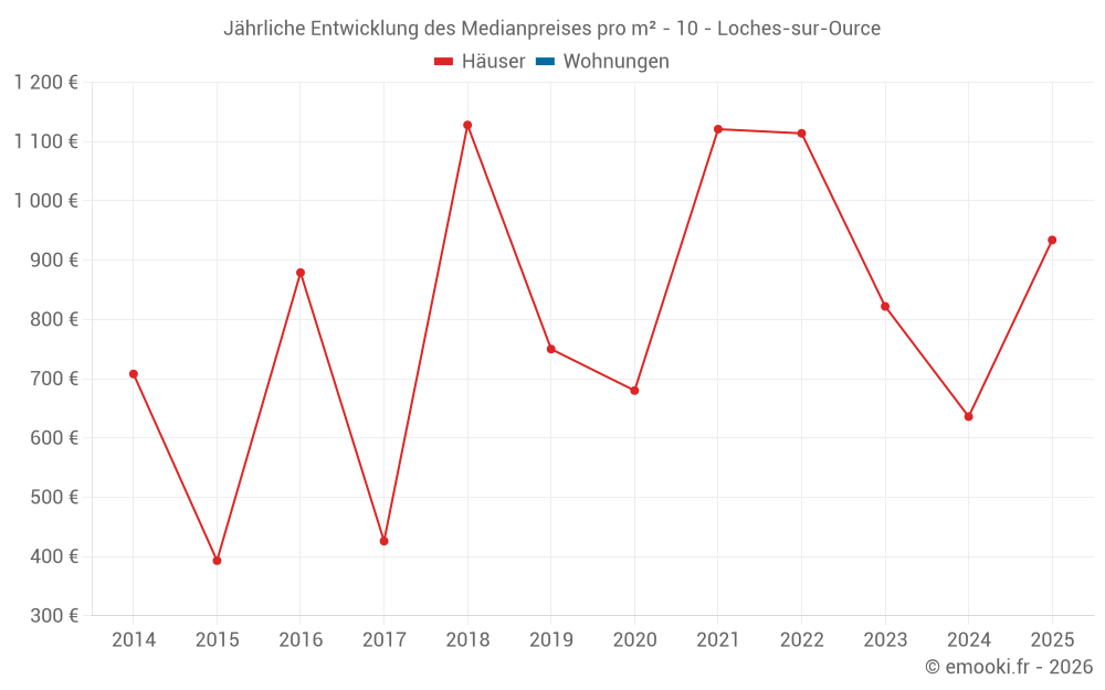 Der Durchschnittspreis auf den 18 Hausgeschäften der letzten 24 Monate in der Gemeinde Loches-sur-Ource betrug 732 € pro Quadratmeter für einen mittleren Immobilienwert von 63 000 €. Über diesen Zeitraum hinweg lagen 60% der Transaktionen zwischen 371 und 1 069 € pro Quadratmeter (vom 2. bis zum 8. Dezil).