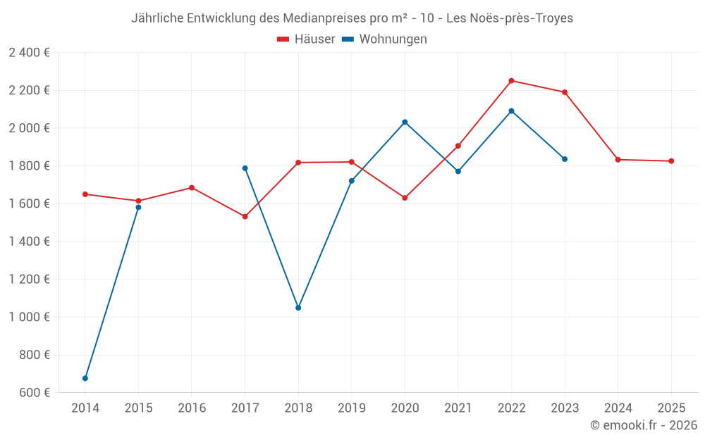 Der Durchschnittspreis auf den 25 Hausgeschäften der letzten 24 Monate in der Gemeinde Les Noës-près-Troyes betrug 1 833 € pro Quadratmeter für einen mittleren Immobilienwert von 185 000 €. Über diesen Zeitraum hinweg lagen 60% der Transaktionen zwischen 1 438 und 2 350 € pro Quadratmeter (vom 2. bis zum 8. Dezil).