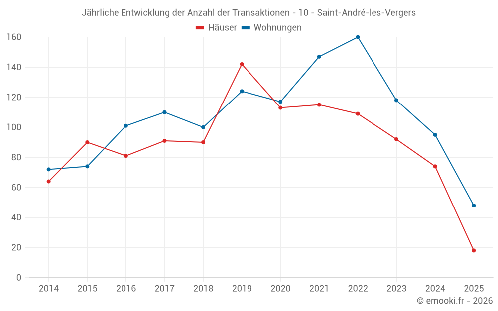 Der Durchschnittspreis auf den 18 Hausgeschäften der letzten 6 Monate in der Gemeinde Saint-André-les-Vergers betrug 1 792 € pro Quadratmeter für einen mittleren Immobilienwert von 154 550 €. Über diesen Zeitraum hinweg lagen 60% der Transaktionen zwischen 1 736 und 2 096 € pro Quadratmeter (vom 2. bis zum 8. Dezil).