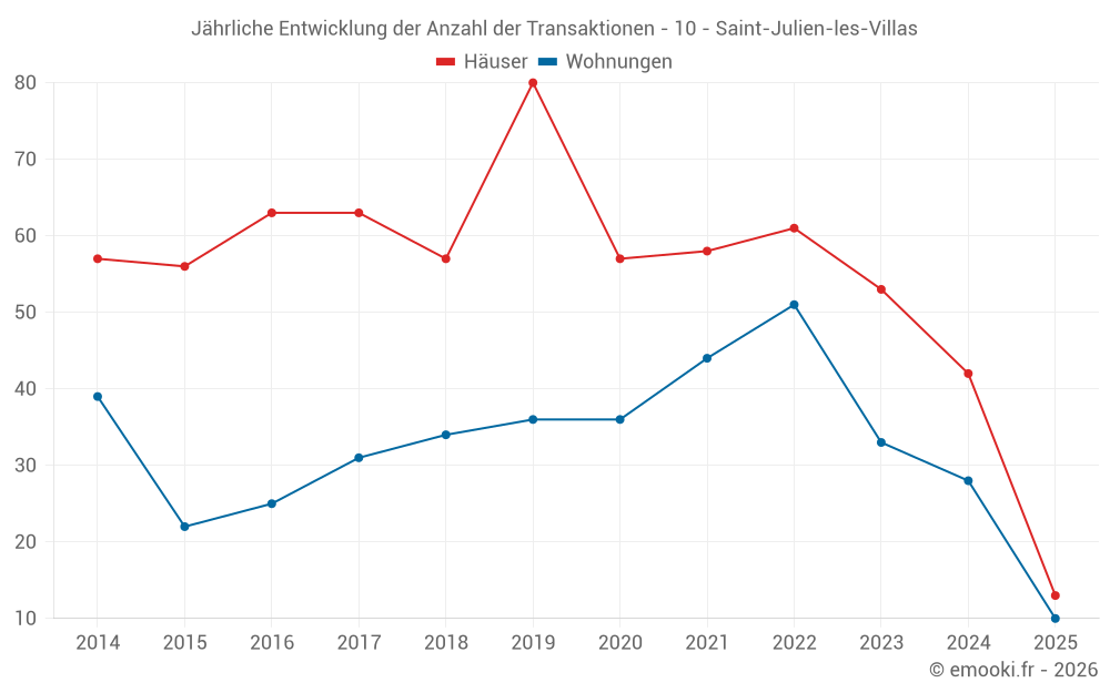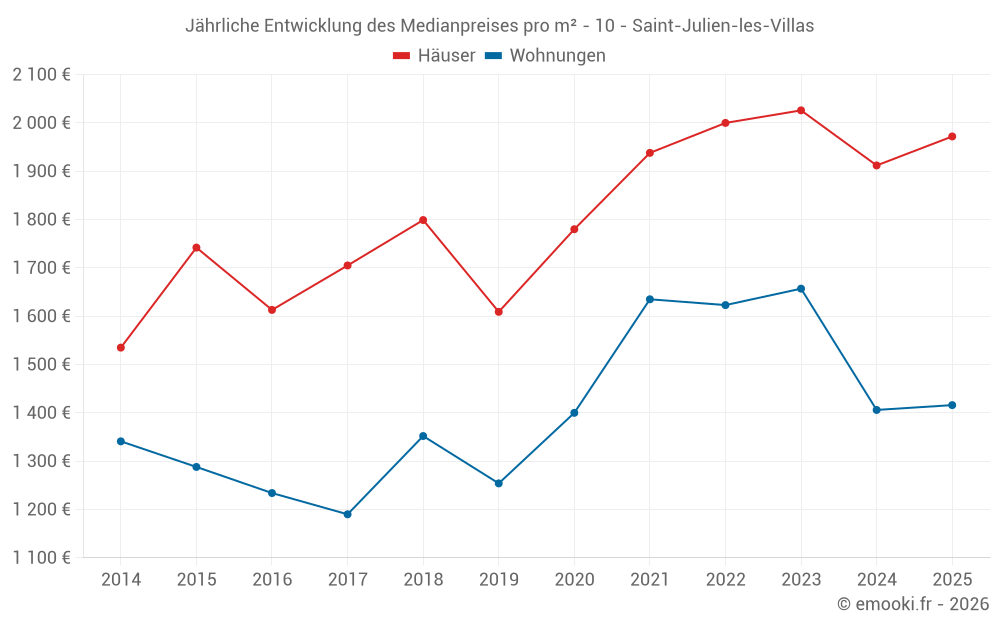Der Durchschnittspreis auf den 26 Wohnungstransaktionen der letzten 12 Monate in der Gemeinde Saint-Julien-les-Villas betrug 1 418 € pro Quadratmeter für einen mittleren Immobilienwert von 81 000 €. Über diesen Zeitraum hinweg lagen 60% der Transaktionen zwischen 1 061 und 1 667 € pro Quadratmeter (vom 2. bis zum 8. Dezil).