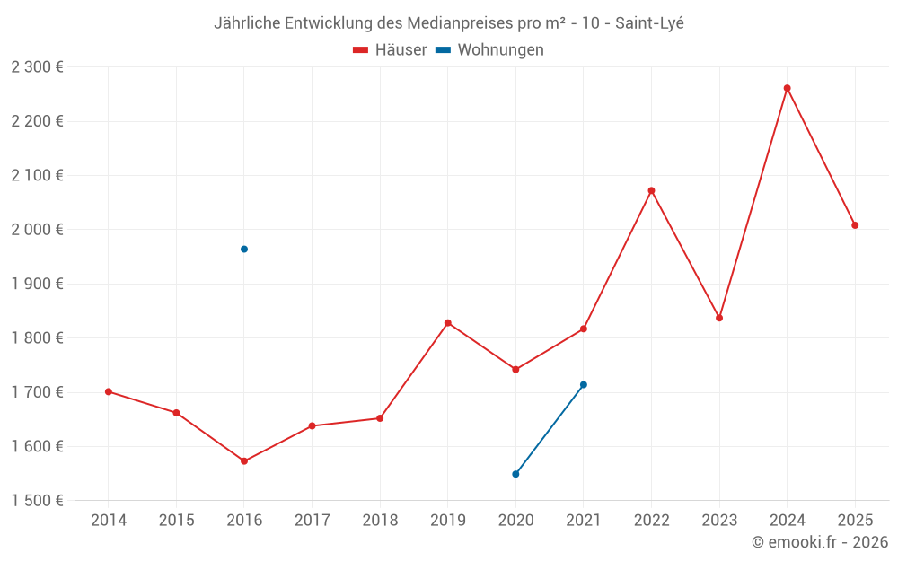 Der Durchschnittspreis auf den 17 Hausgeschäften der letzten 12 Monate in der Gemeinde Saint-Lyé betrug 2 027 € pro Quadratmeter für einen mittleren Immobilienwert von 190 000 €. Über diesen Zeitraum hinweg lagen 60% der Transaktionen zwischen 1 591 und 2 342 € pro Quadratmeter (vom 2. bis zum 8. Dezil).
