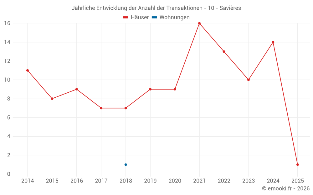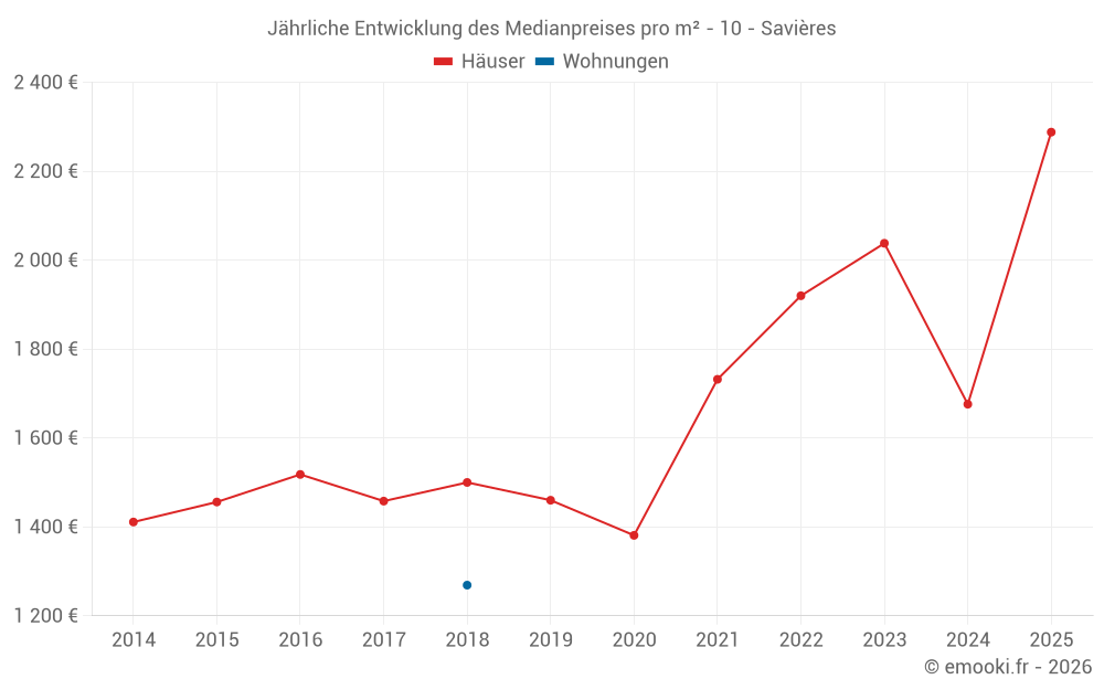 Der Durchschnittspreis auf den 22 Hausgeschäften der letzten 24 Monate in der Gemeinde Savières betrug 1 839 € pro Quadratmeter für einen mittleren Immobilienwert von 179 050 €. Über diesen Zeitraum hinweg lagen 60% der Transaktionen zwischen 1 361 und 2 285 € pro Quadratmeter (vom 2. bis zum 8. Dezil).