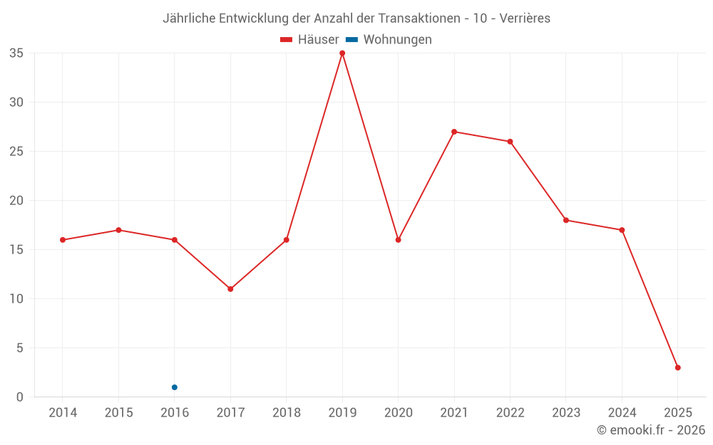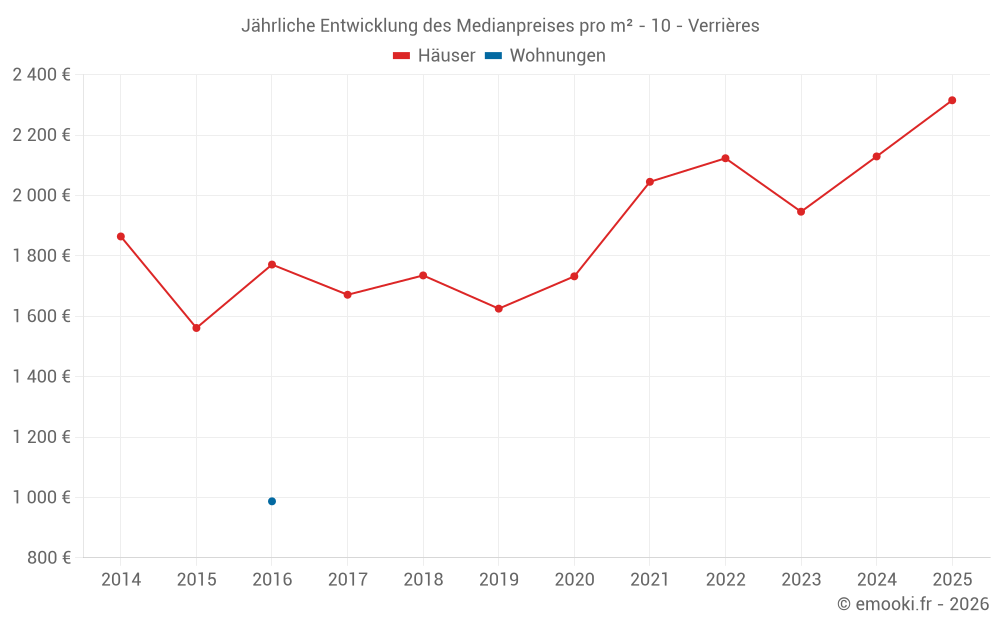 Der Durchschnittspreis auf den 26 Hausgeschäften der letzten 24 Monate in der Gemeinde Verrières betrug 2 016 € pro Quadratmeter für einen mittleren Immobilienwert von 176 250 €. Über diesen Zeitraum hinweg lagen 60% der Transaktionen zwischen 1 616 und 2 366 € pro Quadratmeter (vom 2. bis zum 8. Dezil).