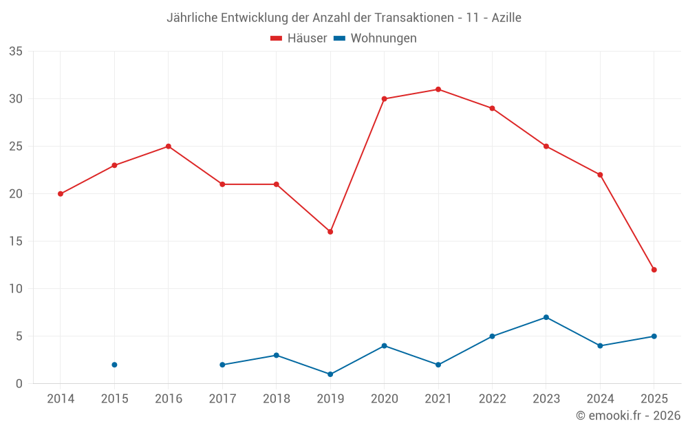 Der Durchschnittspreis auf den 24 Hausgeschäften der letzten 12 Monate in der Gemeinde Azille betrug 1 097 € pro Quadratmeter für einen mittleren Immobilienwert von 113 175 €. Über diesen Zeitraum hinweg lagen 60% der Transaktionen zwischen 547 und 1 834 € pro Quadratmeter (vom 2. bis zum 8. Dezil).