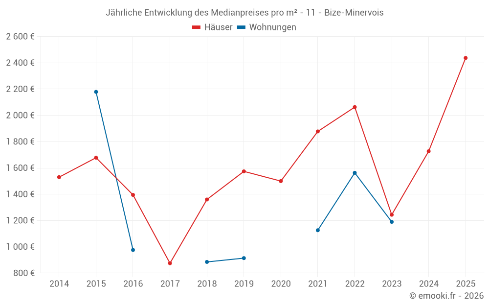 Der Durchschnittspreis auf den 24 Hausgeschäften der letzten 12 Monate in der Gemeinde Bize-Minervois betrug 2 034 € pro Quadratmeter für einen mittleren Immobilienwert von 221 200 €. Über diesen Zeitraum hinweg lagen 60% der Transaktionen zwischen 1 477 und 2 742 € pro Quadratmeter (vom 2. bis zum 8. Dezil).