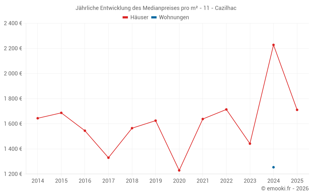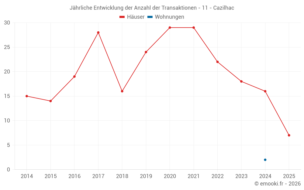 Der Durchschnittspreis auf den 19 Hausgeschäften der letzten 12 Monate in der Gemeinde Cazilhac betrug 1 909 € pro Quadratmeter für einen mittleren Immobilienwert von 189 000 €. Über diesen Zeitraum hinweg lagen 60% der Transaktionen zwischen 1 691 und 2 445 € pro Quadratmeter (vom 2. bis zum 8. Dezil).