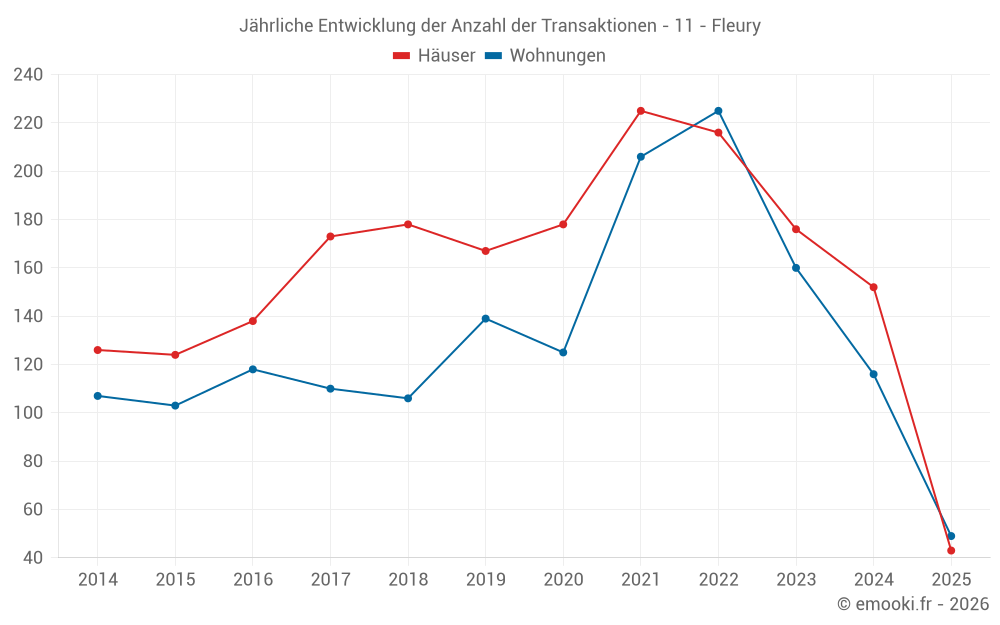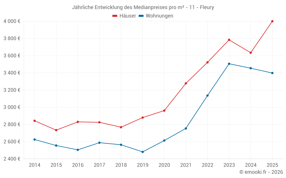 Der Durchschnittspreis auf den 49 Wohnungstransaktionen der letzten 6 Monate in der Gemeinde Fleury betrug 3 398 € pro Quadratmeter für einen mittleren Immobilienwert von 96 105 €. Über diesen Zeitraum hinweg lagen 60% der Transaktionen zwischen 2 913 und 4 229 € pro Quadratmeter (vom 2. bis zum 8. Dezil).