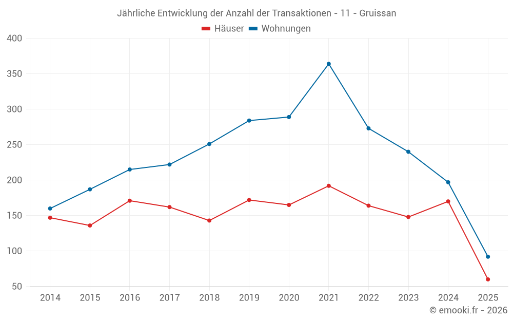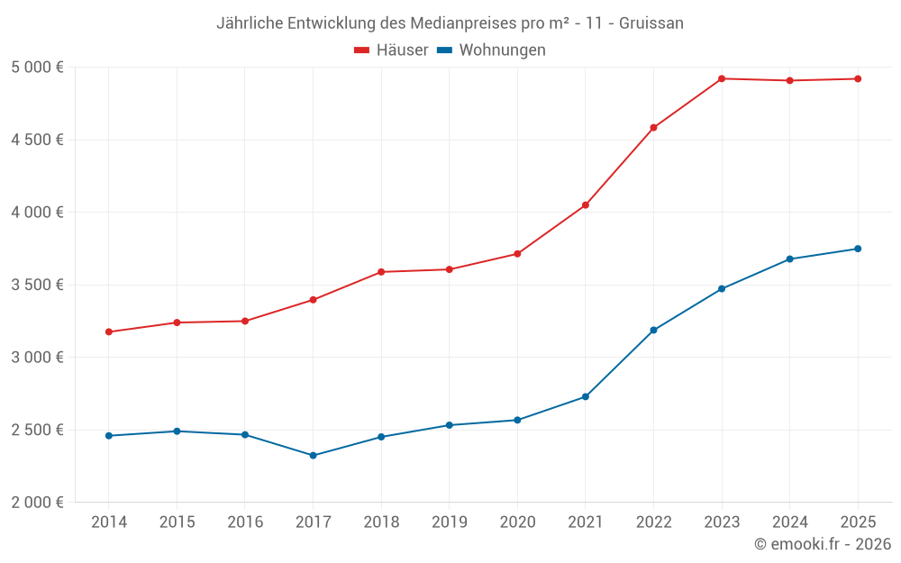 Der Durchschnittspreis auf den 29 Hausgeschäften der letzten 3 Monate in der Gemeinde Gruissan betrug 5 422 € pro Quadratmeter für einen mittleren Immobilienwert von 198 315 €. Über diesen Zeitraum hinweg lagen 60% der Transaktionen zwischen 4 346 und 5 909 € pro Quadratmeter (vom 2. bis zum 8. Dezil).