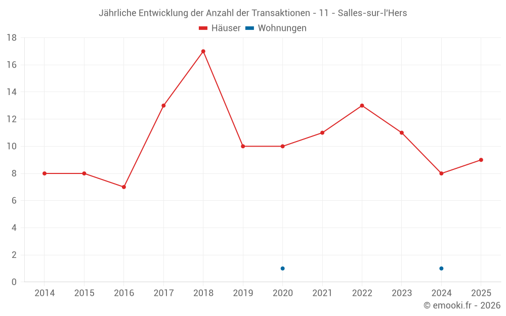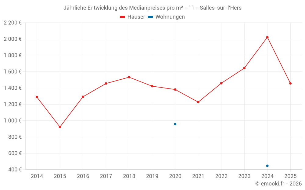 Der Durchschnittspreis auf den 25 Hausgeschäften der letzten 24 Monate in der Gemeinde Salles-sur-l'Hers betrug 1 579 € pro Quadratmeter für einen mittleren Immobilienwert von 143 000 €. Über diesen Zeitraum hinweg lagen 60% der Transaktionen zwischen 929 und 2 295 € pro Quadratmeter (vom 2. bis zum 8. Dezil).
