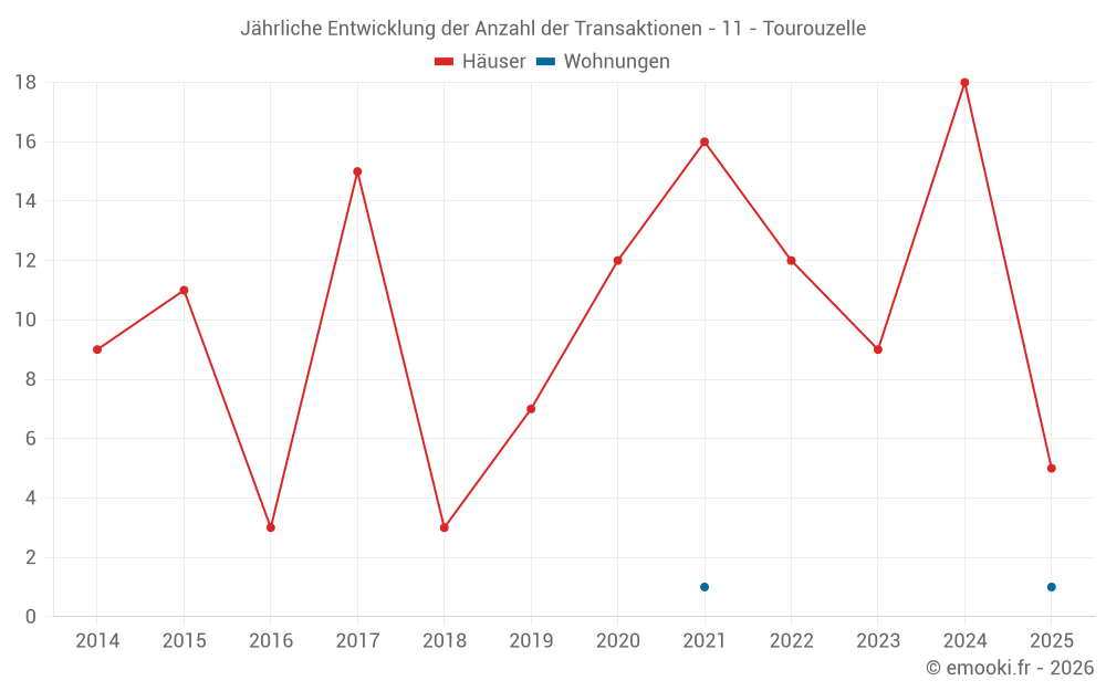 Der Durchschnittspreis auf den 28 Hausgeschäften der letzten 24 Monate in der Gemeinde Tourouzelle betrug 1 476 € pro Quadratmeter für einen mittleren Immobilienwert von 142 050 €. Über diesen Zeitraum hinweg lagen 60% der Transaktionen zwischen 603 und 2 476 € pro Quadratmeter (vom 2. bis zum 8. Dezil).