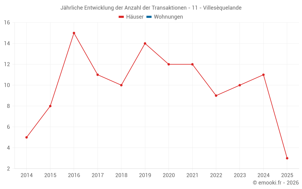 Der Durchschnittspreis auf den 18 Hausgeschäften der letzten 24 Monate in der Gemeinde Villesèquelande betrug 1 699 € pro Quadratmeter für einen mittleren Immobilienwert von 154 600 €. Über diesen Zeitraum hinweg lagen 60% der Transaktionen zwischen 1 303 und 2 097 € pro Quadratmeter (vom 2. bis zum 8. Dezil).