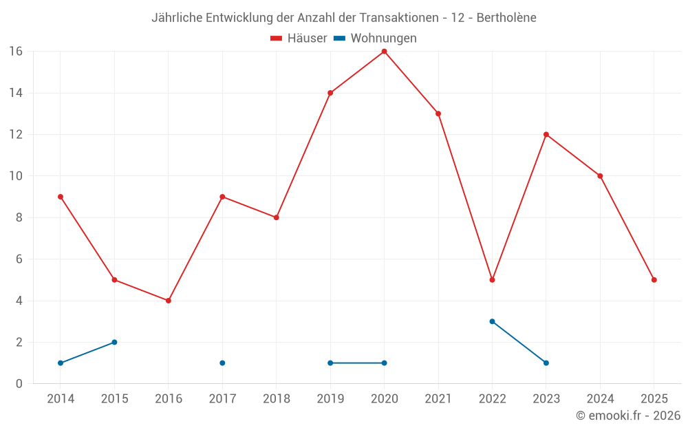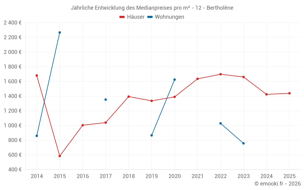 Der Durchschnittspreis auf den 22 Hausgeschäften der letzten 24 Monate in der Gemeinde Bertholène betrug 1 352 € pro Quadratmeter für einen mittleren Immobilienwert von 156 500 €. Über diesen Zeitraum hinweg lagen 60% der Transaktionen zwischen 776 und 1 773 € pro Quadratmeter (vom 2. bis zum 8. Dezil).