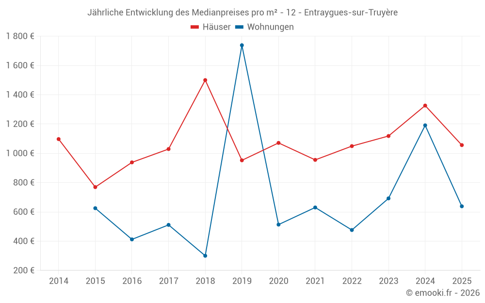Der Durchschnittspreis auf den 27 Hausgeschäften der letzten 24 Monate in der Gemeinde Entraygues-sur-Truyère betrug 1 118 € pro Quadratmeter für einen mittleren Immobilienwert von 105 000 €. Über diesen Zeitraum hinweg lagen 60% der Transaktionen zwischen 905 und 1 716 € pro Quadratmeter (vom 2. bis zum 8. Dezil).