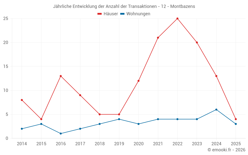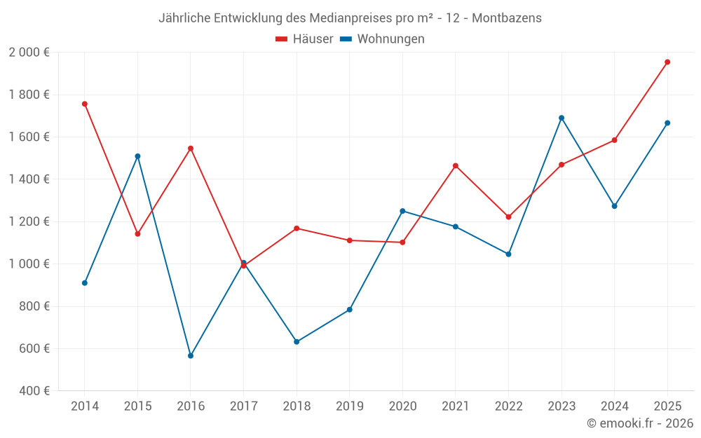 Der Durchschnittspreis auf den 33 Hausgeschäften der letzten 24 Monate in der Gemeinde Montbazens betrug 1 532 € pro Quadratmeter für einen mittleren Immobilienwert von 133 000 €. Über diesen Zeitraum hinweg lagen 60% der Transaktionen zwischen 1 028 und 2 092 € pro Quadratmeter (vom 2. bis zum 8. Dezil).