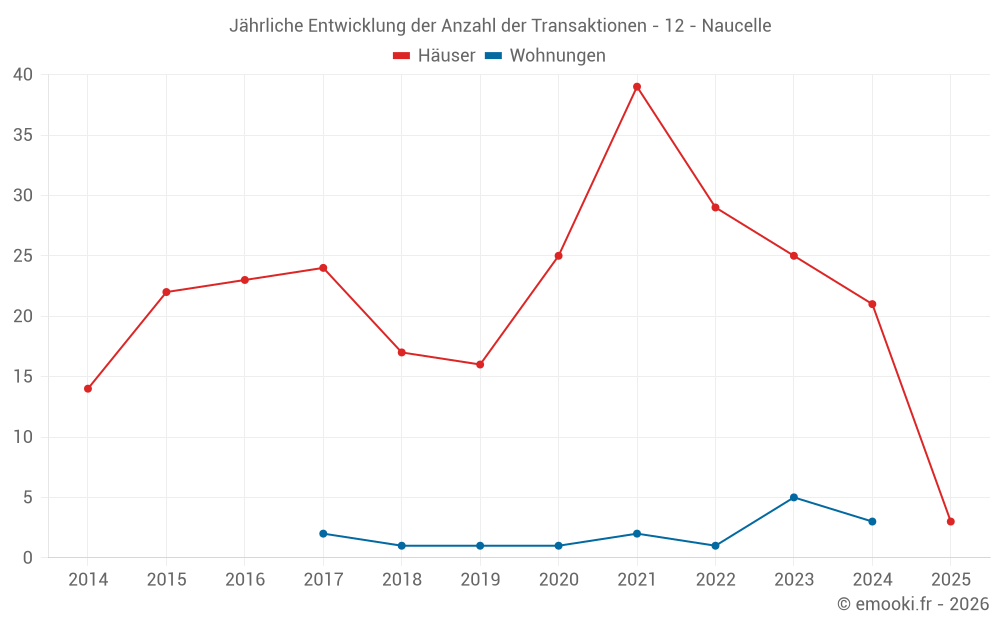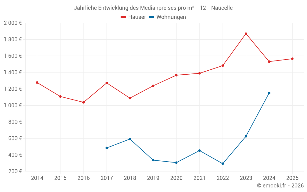 Der Durchschnittspreis auf den 37 Hausgeschäften der letzten 24 Monate in der Gemeinde Naucelle betrug 1 531 € pro Quadratmeter für einen mittleren Immobilienwert von 162 850 €. Über diesen Zeitraum hinweg lagen 60% der Transaktionen zwischen 1 095 und 2 030 € pro Quadratmeter (vom 2. bis zum 8. Dezil).