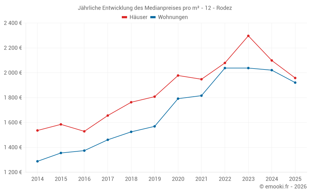 Der Durchschnittspreis auf den 23 Hausgeschäften der letzten 6 Monate in der Gemeinde Rodez betrug 1 958 € pro Quadratmeter für einen mittleren Immobilienwert von 205 000 €. Über diesen Zeitraum hinweg lagen 60% der Transaktionen zwischen 1 392 und 2 377 € pro Quadratmeter (vom 2. bis zum 8. Dezil).