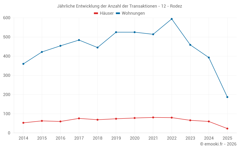 Der Durchschnittspreis auf den 83 Wohnungstransaktionen der letzten 3 Monate in der Gemeinde Rodez betrug 1 983 € pro Quadratmeter für einen mittleren Immobilienwert von 106 000 €. Über diesen Zeitraum hinweg lagen 60% der Transaktionen zwischen 1 608 und 2 504 € pro Quadratmeter (vom 2. bis zum 8. Dezil).