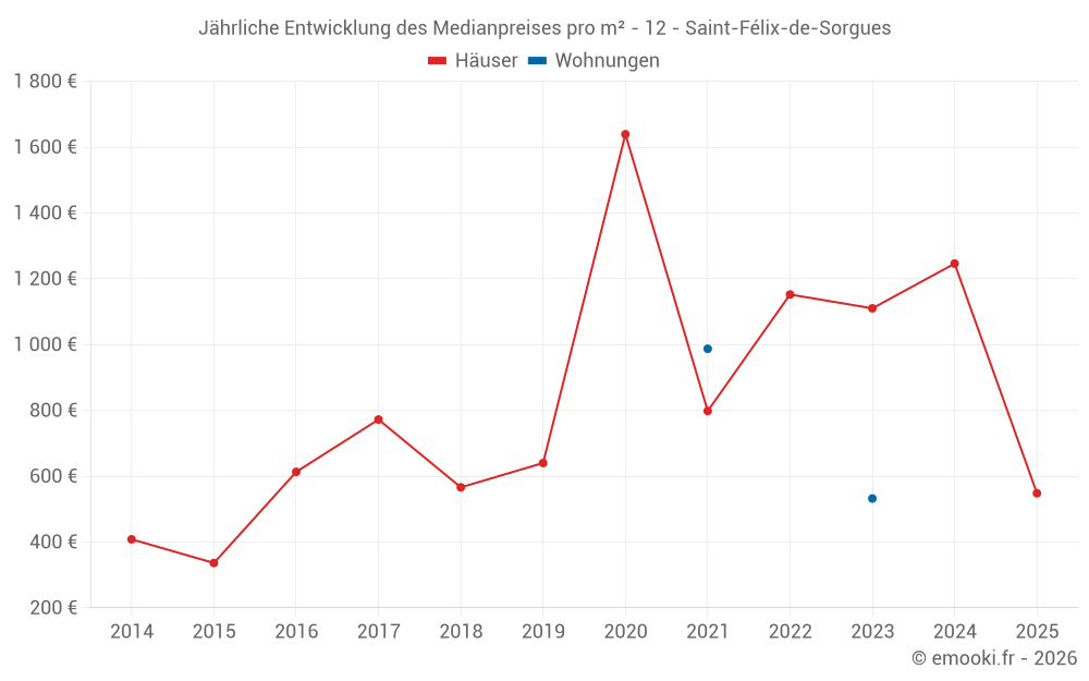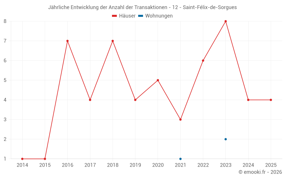 Der Durchschnittspreis auf den 14 Hausgeschäften der letzten 24 Monate in der Gemeinde Saint-Félix-de-Sorgues betrug 862 € pro Quadratmeter für einen mittleren Immobilienwert von 70 500 €. Über diesen Zeitraum hinweg lagen 60% der Transaktionen zwischen 581 und 1 680 € pro Quadratmeter (vom 2. bis zum 8. Dezil).