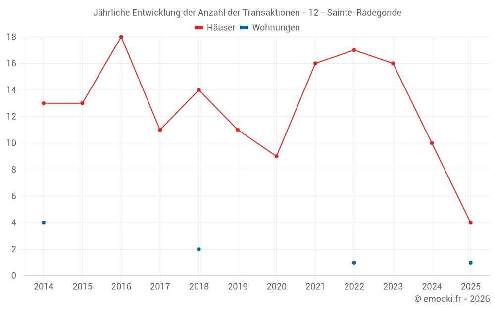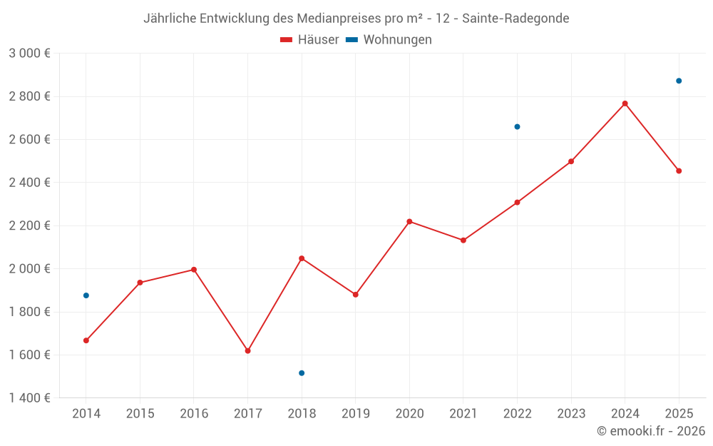 Der Durchschnittspreis auf den 23 Hausgeschäften der letzten 24 Monate in der Gemeinde Sainte-Radegonde betrug 2 647 € pro Quadratmeter für einen mittleren Immobilienwert von 284 350 €. Über diesen Zeitraum hinweg lagen 60% der Transaktionen zwischen 2 228 und 3 084 € pro Quadratmeter (vom 2. bis zum 8. Dezil).