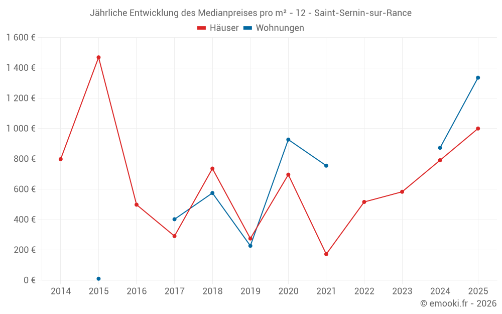 Der Preis pro m² von Häusern ist seit 6 Jahren um 264% gestiegen, aber er ist in 10 Jahren um 32% gesunken.