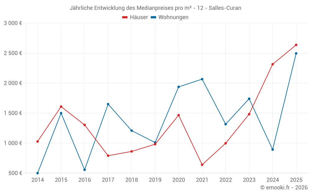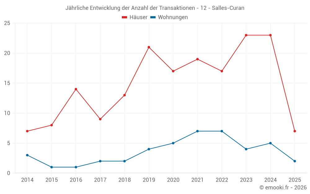 Der Durchschnittspreis auf den 19 Hausgeschäften der letzten 12 Monate in der Gemeinde Salles-Curan betrug 2 637 € pro Quadratmeter für einen mittleren Immobilienwert von 165 000 €. Über diesen Zeitraum hinweg lagen 60% der Transaktionen zwischen 1 735 und 3 898 € pro Quadratmeter (vom 2. bis zum 8. Dezil).
