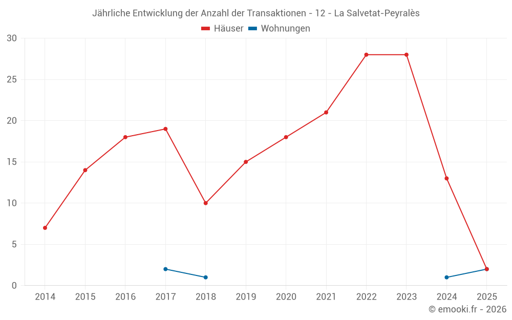 Der Durchschnittspreis auf den 33 Hausgeschäften der letzten 24 Monate in der Gemeinde La Salvetat-Peyralès betrug 1 309 € pro Quadratmeter für einen mittleren Immobilienwert von 120 000 €. Über diesen Zeitraum hinweg lagen 60% der Transaktionen zwischen 636 und 1 961 € pro Quadratmeter (vom 2. bis zum 8. Dezil).