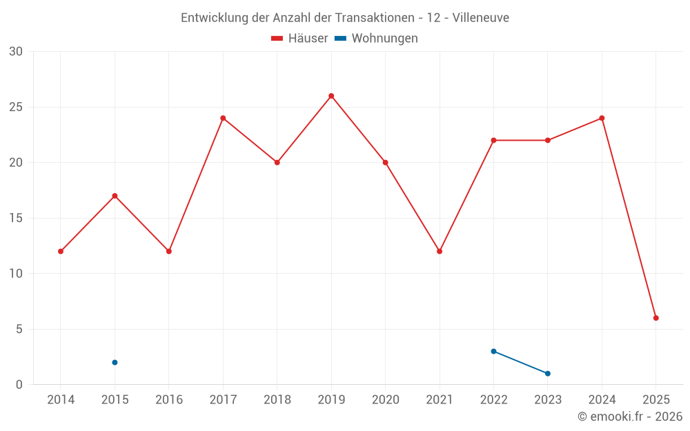 Der Durchschnittspreis auf den 18 Hausgeschäften der letzten 12 Monate in der Gemeinde Villeneuve betrug 1 736 € pro Quadratmeter für einen mittleren Immobilienwert von 187 500 €. Über diesen Zeitraum hinweg lagen 60% der Transaktionen zwischen 1 151 und 1 930 € pro Quadratmeter (vom 2. bis zum 8. Dezil).