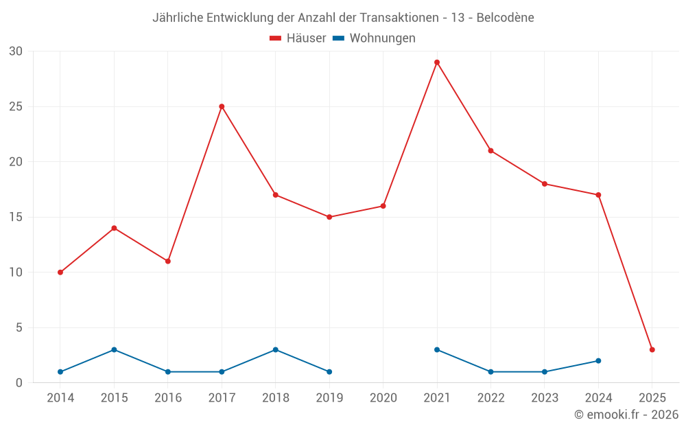 Der Durchschnittspreis auf den 25 Hausgeschäften der letzten 24 Monate in der Gemeinde Belcodène betrug 4 425 € pro Quadratmeter für einen mittleren Immobilienwert von 490 000 €. Über diesen Zeitraum hinweg lagen 60% der Transaktionen zwischen 3 884 und 5 206 € pro Quadratmeter (vom 2. bis zum 8. Dezil).
