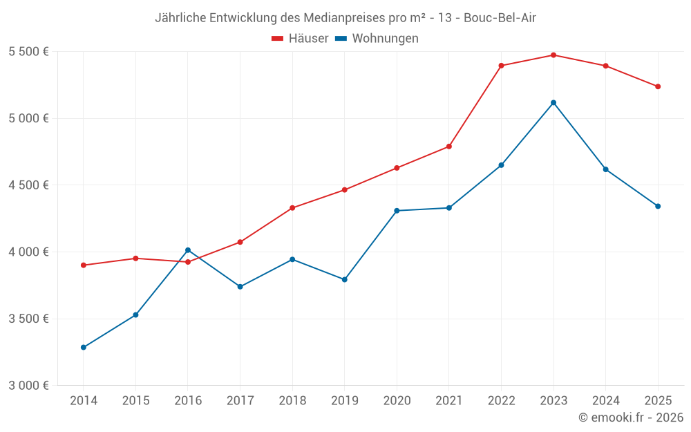 Der Durchschnittspreis auf den 26 Wohnungstransaktionen der letzten 12 Monate in der Gemeinde Bouc-Bel-Air betrug 4 656 € pro Quadratmeter für einen mittleren Immobilienwert von 324 500 €. Über diesen Zeitraum hinweg lagen 60% der Transaktionen zwischen 3 892 und 5 750 € pro Quadratmeter (vom 2. bis zum 8. Dezil).