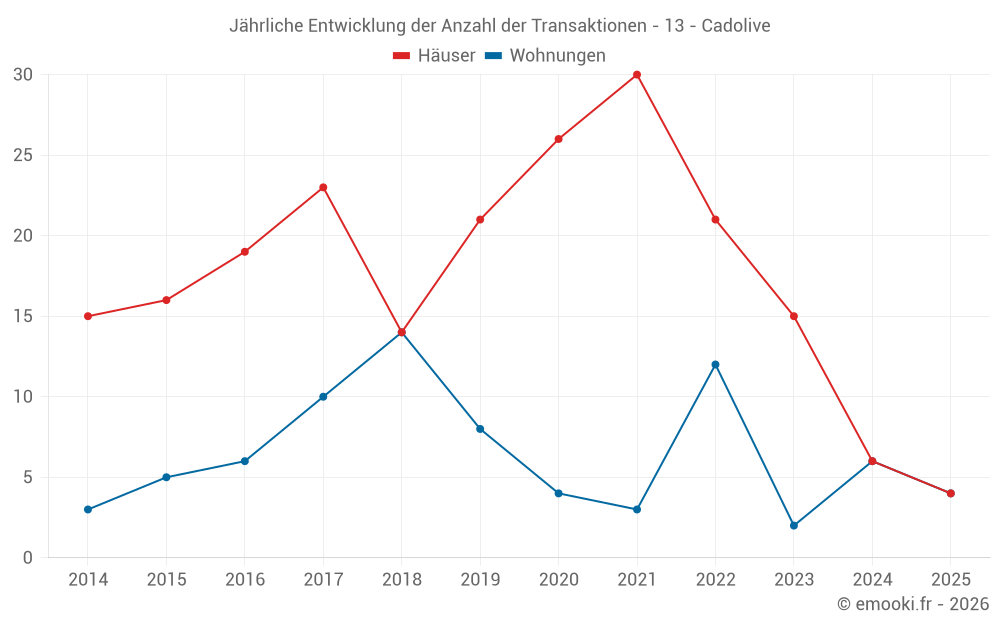Der Durchschnittspreis auf den 20 Hausgeschäften der letzten 24 Monate in der Gemeinde Cadolive betrug 4 928 € pro Quadratmeter für einen mittleren Immobilienwert von 417 500 €. Über diesen Zeitraum hinweg lagen 60% der Transaktionen zwischen 3 747 und 5 795 € pro Quadratmeter (vom 2. bis zum 8. Dezil).